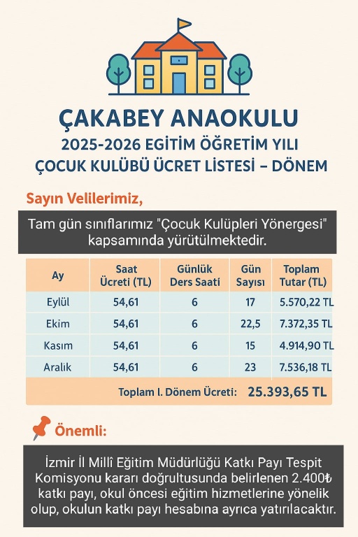 İzmir İl Millî Eğitim Müdürlüğü Katkı Payı Tespit Komisyonu kararı doğrultusunda belirlenen 2.400₺ katkı payı, okul öncesi eğitim hizmetlerine yönelik olup, okulun katkı payı hesabına ayrıca yatırılacaktır.